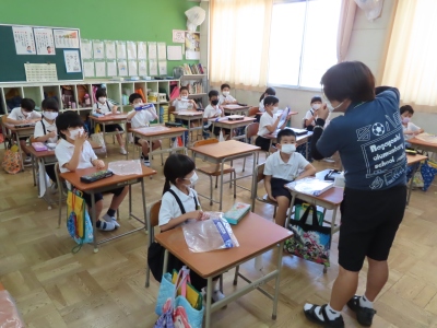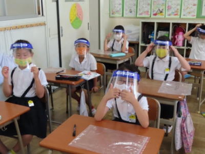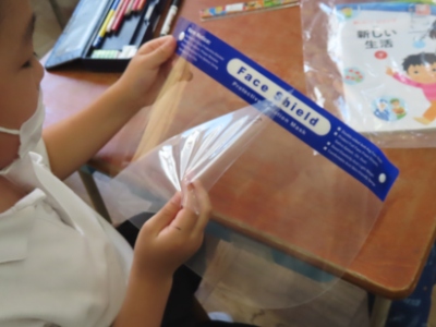 前面の被膜カバーをめくってから、前面と後ろのゴムに名前を書きました。子どもたちはなんだか楽しそうにつけていましたが、装着した本人が感染しないための防護具です。物が歪んで見えたり、光が反射して、授業に集中できない可能性や、転倒などで顔面や眼を傷つける心配があります。熱中症のリスクも高いことから、感染のリスクが高い活動のときに使用していきます。