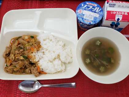6月17日(水)のこんだては、「和風カレー丼、もずくとオクラのとろり汁、ヨーグルト、牛乳」です。