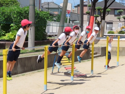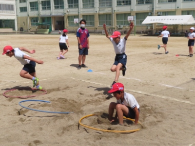7月2日(木)2限、4年生の2クラスは、運動場で体育の授業でした。1組は砂場で、「幅跳び」の練習と記録測定をしました。3組は「鉄棒」の授業で、つばめ、前まわり、さか上がりなどを練習しました。