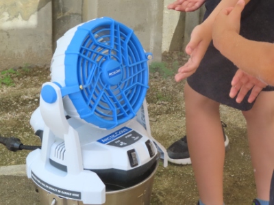 今日から運動場には休憩用のテントを設置し、熱中症対策用に新しく購入した「ミストファン」【写真中】を2台置きました。子どもたちは、霧の前で手をあてたり、体を近づけたりして、涼んでいました。