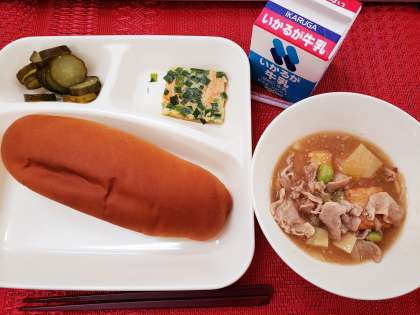 7月2日(水)のこんだては、「黒糖パン、豚肉と野菜の煮物、チヂミ、きゅうりの甘酢あえ、牛乳」です。