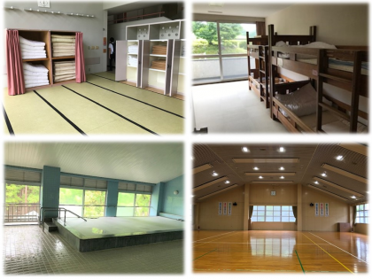 打ち合わせ後は、宿舎内の宿泊棟や大浴場、プレイホールなど【写真上】を案内してもらいました。宿泊室は広々としており、とても清潔でした。400人が活動できるプレイホールもあり、本番が雨の場合でも、いろいろな活動ができそうです。