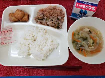 7月8日(水)のこんだては、「ごはん、ゴーヤチャンプルー、すまし汁、あつあげのしょうがじょうゆかけ、牛乳」です。