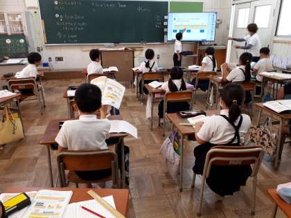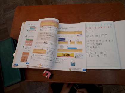 7月8日(水)2限、2年1組は算数科「長さのたんい」の学習でした。めあては「ものさしの目もりを読もう」です。教科書の問題を見て、「何センチメートル何ミリメートル」かを読み取る学習です。2年生では3学期に「メートル」の単位まで学習します。