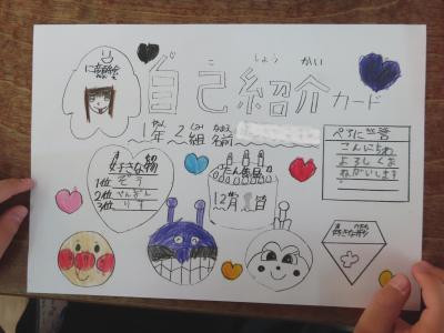まず、グループのリーダー、副リーダーを決め、グループの名前を決めました。そしてペアが決まったら、計画委員会が作った「自己紹介カード」を書いていきました。最後は好きな物や似顔絵、誕生日などを書いた自己紹介カードを交換して、1年生はペアの6年生に「一年間、よろしくお願いします。」とあいさつをしていました。