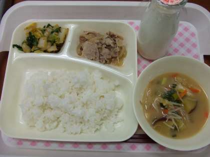 「豚肉のしょうが焼き、さつまいものみそ汁、きくなとはくさいのごまあえ、