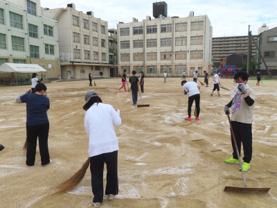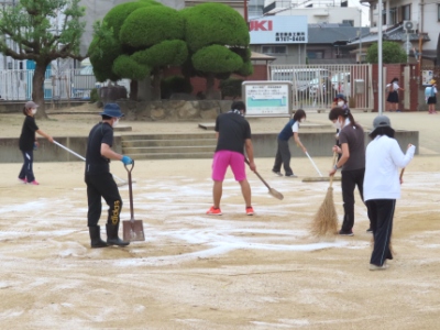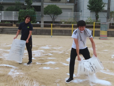 9月4日(金)放課後、午前中に雨もあがったので、体育参観に向けて、全教職員で運動場の「にがり散布」を行いました。運動場のへこんだ所を盛土し、にがりの粉末を均等に散布していきました。