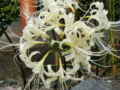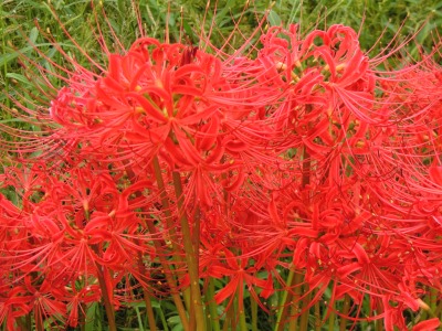 秋分の日とその前後3日を合わせた7日間を「お彼岸」といいます。彼岸花は、秋のお彼岸の時期になると、どこからともなく咲いてくる花です。枝も葉も節もない茎の先端に、鮮やかな赤い花をつけます。稀に白い花もあります。花が咲いた後に葉が出てきて、冬を越して春に枯れます。球根には毒があり、土の中の生き物から作物を守るために、田んぼや畑のあぜ道などに植えられています。長吉小学校でも、毎年2か所で咲きますので、探してみてください。