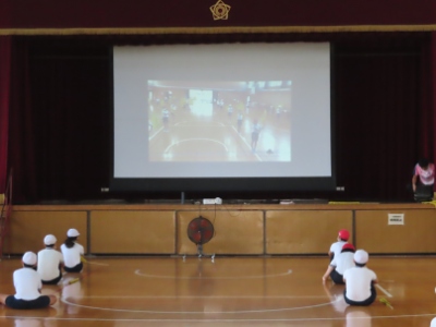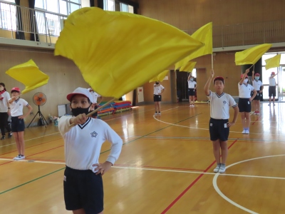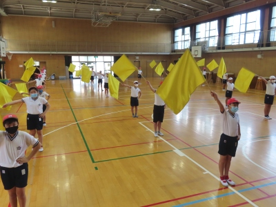今年度は感染症拡大の影響から、「組体操」は禁止されましたので、フラッグを使った団体演技を考察中です。十分に間隔をあけて、隊形移動も少なくしています。最後は自分たちの演技をスクリーンに映し出し【写真右】て、みんなで確認をしました。これから本番に向けて、技を磨いていく予定です。