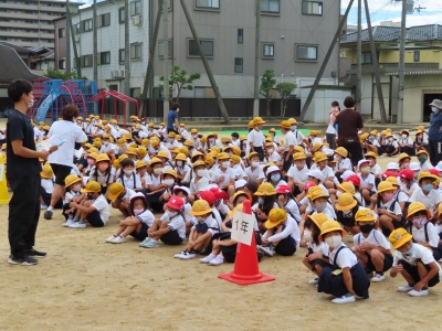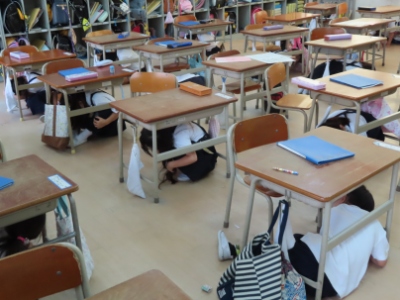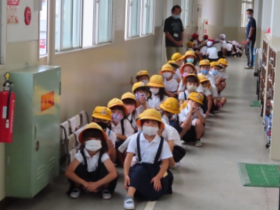 地震が発生して1年生は机の下に避難【写真左】しました。揺れがおさまったので、運動場に「お・は・し・も」で避難をしました。今日は3分22秒で避難を完了し、昨年よりも25秒も早く避難できました。長吉幼稚園の園児28人も防災訓練に参加をしました。全員が運動場に避難をして、校長先生からの講評の後、津波に備えて校舎の3階以上で、静かに避難【写真右】をしました。