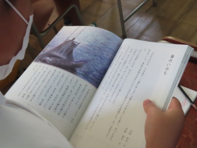 全員が音読【写真左】をした後、太一の心情が変化した場面を考えました。その後、班で話し合いをして考えを広げ、父の命を奪った瀬の主(クエ)に対する気持ちの変化に着目しました。物語の主題にせまり、作品の対する自分なりの考えをノートにまとめていきました。