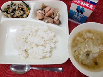 9月11日(金)のこんだては、「ごはん、さけのしょうゆ風味焼き、五目汁、高野どうふのいり煮、牛乳」です。