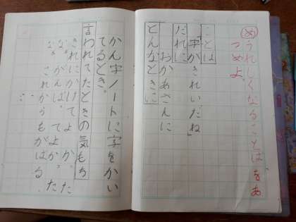 まず、どんな言葉をだれに言われて、どんな気持ちだったのかを思い出しながらノートに書きました。家族や先生にほめられた時や、友だちに「ありがとう」と言われたときがうれしかったなどと書いていました。一人ずつ発表していくと、ほめられてもっとがんばろうという気持ちになったと発表している子もいました。