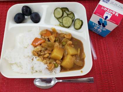 9月17日(木)のこんだては、「チキンカレーライス、きゅうりのピクルス、ぶどう(巨峰)、牛乳」です。