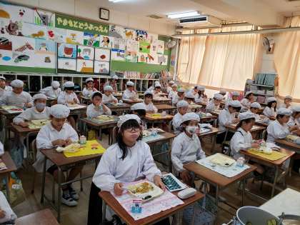 「チキンカレーライス(米粉)」は、鶏肉を主材に、小麦アレルギーの児童に配慮した米粉のカレールウの素で味付けしました。好評な献立のひとつです。画像は3年生です。よく食べてくれていました。おいしくいただきました。