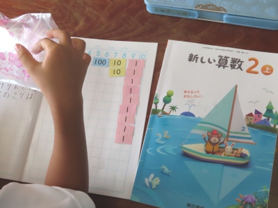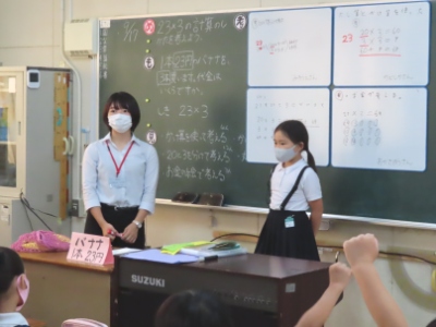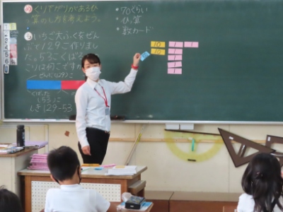 2年生は算数科「ひっ算の仕方を考えよう」の単元でした。数カードを使って繰り下がりがあることを学習しました。3年生は算数科「大きい数のかけ算の仕方を考えよう」でした。いろいろな考え方から、「十と一の位ごとに考えると計算できる」ことがわかりました。二人とも落ち着いて、授業をしていて感心しました。