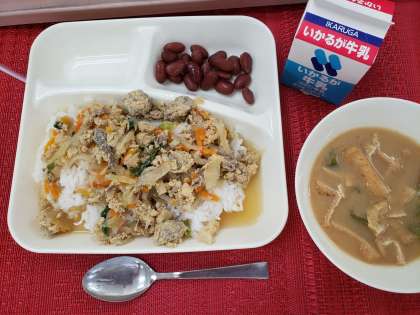 9月18日(金)のこんだては、「他人丼、とうがんのみそ汁、金時豆の煮もの、牛乳」です。