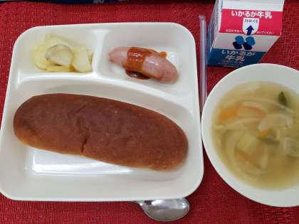 9月23日(水)のこんだては、「黒糖パン、フランクフルトのケチャップソース、スープ、焼きじゃが、牛乳」です。