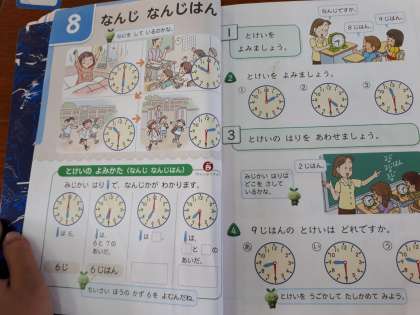 短い針を見ると何時かがわかることや、○時半は数字と数字のまん中に短い針があることを学習しました。3学期には「何時何分」の読み方を学習します。