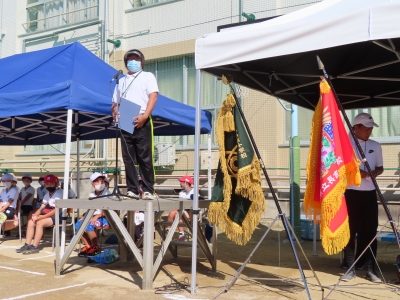 入場後、体操隊形に広がって、音楽にあわせて準備体操をしました。本部前をスタートし、80m走ってゴールをします。