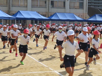4年生は、、個人走「The run!」」です。入場後にグランドを一周し、準備運動をしました。
