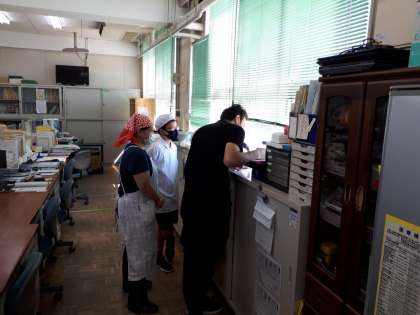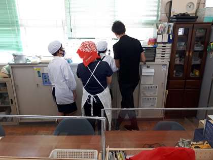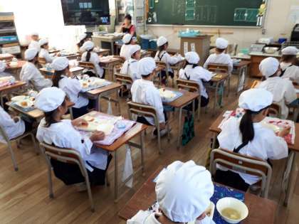 毎日、給食の時間には5・6年生の給食委員会の児童が、職員室から校内放送で「今日の給食」の紹介をしています。献立や食材についてのエピソード、栄養素などが放送で紹介されます。