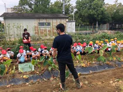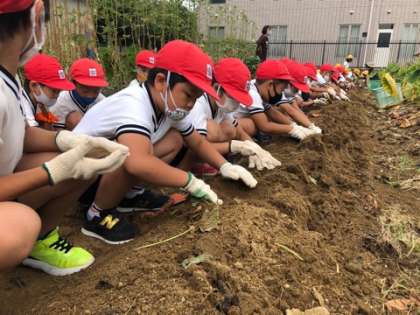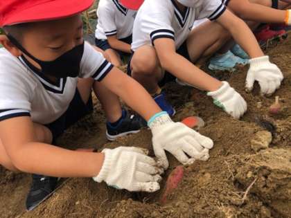 子どもたちは「わあ〜大きい」「なかなか引っぱれない」など、いろいろな歓声を出しながら、友だちとも協力して掘りました。弦の下からは大きな「シルクスイート」が出てきました。大きなイモや小さなイモ、丸いイモなど形はそれぞれで、楽しい体験ができました。