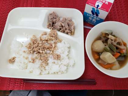 10月5日(月)のこんだては、「ごはん、豚肉のねぎじょうゆ焼き、ふきよせ煮、ツナ大豆そぼろ、牛乳」です。