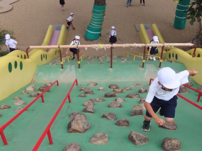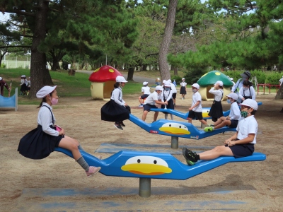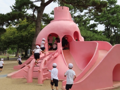 11時に「南児童遊戯場」に到着しました。遊戯場では、シーソーや長いすべり台、タコの島、コンビネーション遊具などで、元気いっぱい遊びました。本校以外の団体はいなかったので、自由に遊ぶことができました。