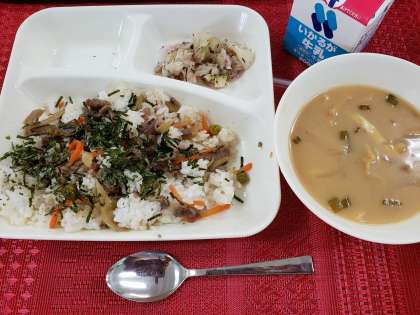 10月8日(木)のこんだては、「牛肉のきんぴらちらし、みそ汁、キャベツの赤じそあえ、牛乳」です。