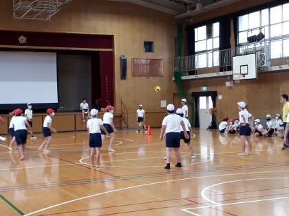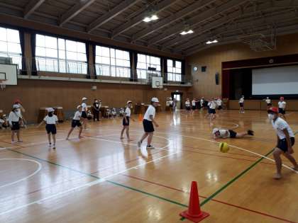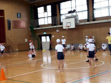 各クラスで赤白の2チームに分かれ、他のクラスとチームと対戦します。1ゲームは4分で、全部で12ゲームしました。好プレーあり、珍プレーあり、ゲームをしている子どもも見ている子どもも楽しそうでした。10月15日から16日に予定している修学旅行に向けて、チームの団結力を高めているように感じられました。