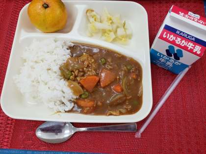 今日のこんだては、「ポークカレーライス、はくさいのピクルス、みかん、牛乳」です。