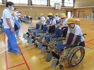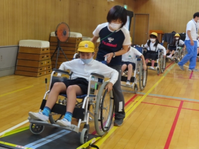 最初に車いすの開き方や閉じ方、キャスターの上げ方を学習した後、実演をしました。その後、体育館のコースを自分ひとりで車いすを動かす「自走体験」を行いました。コースには段差やスロープなどの障害があり、操作は難しかったです。