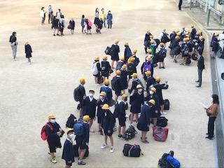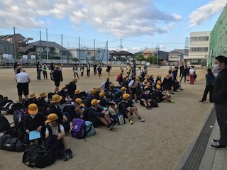 児童の「集合時刻」が迫ってきました。7時15分から児童の登校開始ですが、すでに多くの児童が登校しています。7時30分に集合し、「出発式」を行います。