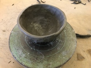 手回しろくろの真ん中に土台を作り、土のひもを積み重ねて背を高くしていきます。ろくろを回して糸を張って口元を切り、角をなくして完成です。最初は湯呑みのつもりが、皿になったり、徳利が湯呑みになったりと悪戦苦闘していました。みんなの作品は、来年2月に「登り窯」で焼きあげ、卒業間近の3月上旬に学校に送られてきます。