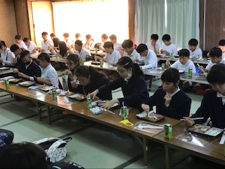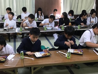12時、陶芸手づくり教室の後は、お弁当の「昼食」です。宗陶苑の大広間で前を向いて、静かにいただきました。