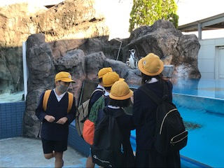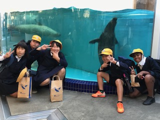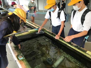 館内ではグループで自由に見学しました。「ふれあいコーナー」では、エイやタコなどを触りました。