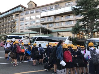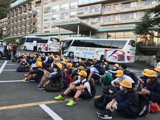 16時50分、宿泊先のホテル「扇芳閣」に到着しました。駐車場広場で「開所式」を行いまさした。二日間、お世話になります。
