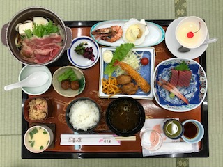 献立は、「牛すき焼き・海老フライ・唐揚げ・お造り、ホタテ貝のタルタル・車海老塩焼き・ミートボール・手こね寿司・茶碗蒸し他」のご馳走でした。