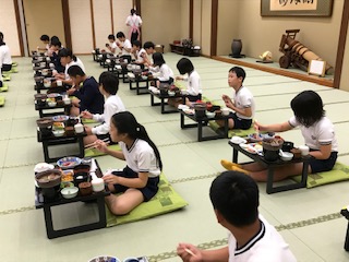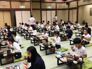 18時、6階の大広間に集合し、豪華な「夕食」をいただきました。今回は全員が前を向いて、また隣との間隔をあけて座りました。食事係の合図で「いただきます」をし、静かに食事をとっていました。