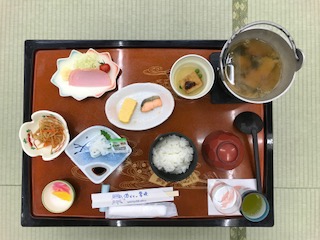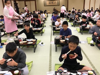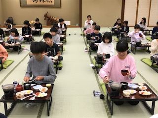 7時15分から大広間で「朝食」をいただきました。献立は、「焼き鮭・出し巻玉子・イカそうめん・厚揚げ・きんぴらこぼう・ハムサラダ他」でした。昨年よりも、ご飯をおかわりする児童が少ないようでした。