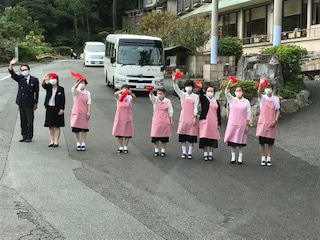 退所式の後、ホテル前でクラス写真を撮りました。9時にバスに乗り込み、ホテルの方々には赤いハンカチを振って(涙を拭くわけではありません)、見送っていただきました。
