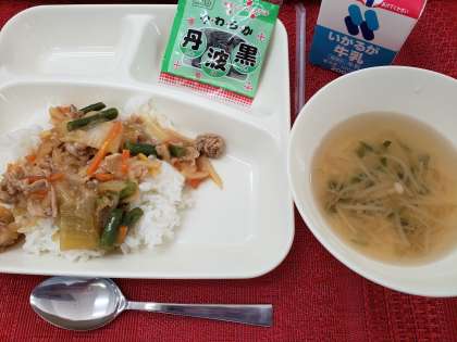 10月20日(火)のこんだては、「ピリ辛丼、中華スープ、ソフト黒豆、牛乳」です。