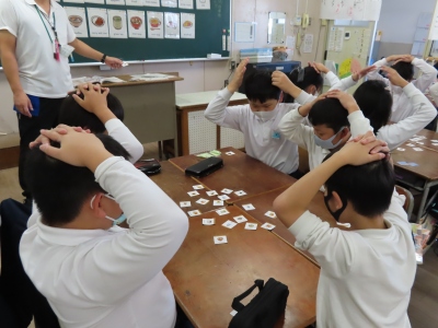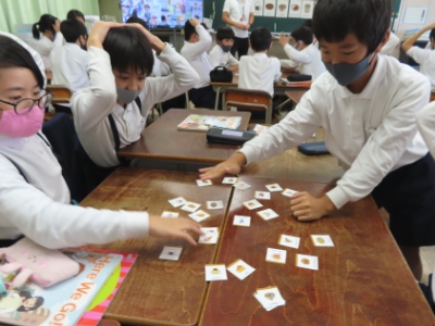 ピクチャーカードを見ながら、食べ物や飲み物の語彙の発声練習をしたあと、ミッシングゲームをしました。その後、班になりピクチャーカードを使って「かるた」をしました。最後は、ワークブックに今日学習した言葉を書いていきました。とても楽しそうに、英語の学習をしていました。