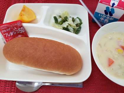 10月のごんだては「コッペパン、いちごジャム、コーンクリームシチュー〔米粉〕、キャベツとさんどまめのサラダ、かき(平核無柿〕、牛乳」です。