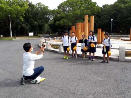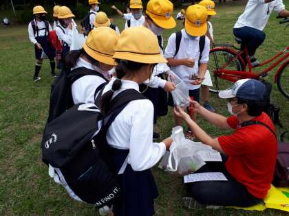 午前中はグループごとに地図を見ながらのオリエンテーリングでした。途中でどんぐりを拾ったり、カマキリやコオロギなどの昆虫を見つけたり、秋の自然の観察もしながらポイントを回りました。ポイントではクイズに答えたり、ポーズを決めて写真を撮ったりしました。