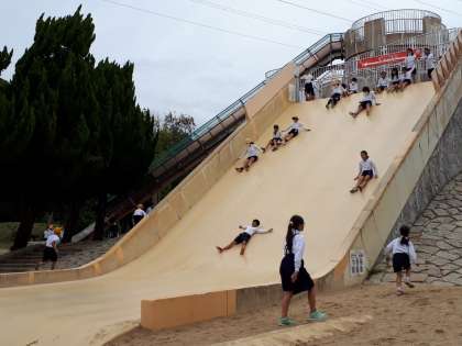 お弁当とおやつを食べた後、冒険ランドに移動して、いろいろな遊具で遊びました。巨大すべり台や長いすべり台では速いスピードにとまどっていた子どもたちもだんだん慣れていき、何度も何度もすべっていました。大型木製遊具でも鬼ごっこをするなど、大いにはしゃいでいました。30分後に集合すると汗だくになって、お茶をごくごく飲んでいました。