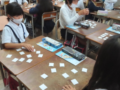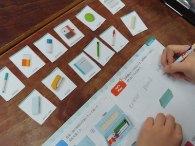 今日は外国語活動教材Let's Try!の「Do you have a pen?」の学習でした。ペアになって、文具のカードを3枚選んで持ち、自分が持っているカードから選んで、「Do you have (文具名)?」と聞いて、そのカードを持っていた「Yes I do」、持っていなければ「No I don't」と答えていきます。消しゴム、筆箱、スティックのり、ステープラなど、聞いていきました。楽しく授業が行われていました。