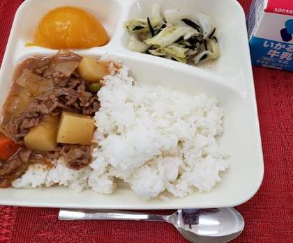 「ハヤシライス」は、小麦アレルギーの児童も食べることができるように、上新粉を使用しています。おいしくいただきました。