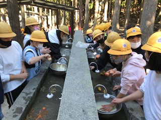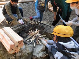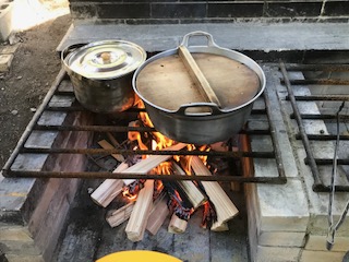 11時、宿舎裏の野外炊飯場に集合して、「カレー作り」を行いました。初めてカマドで火を起こして、飯盒でご飯を炊きました。